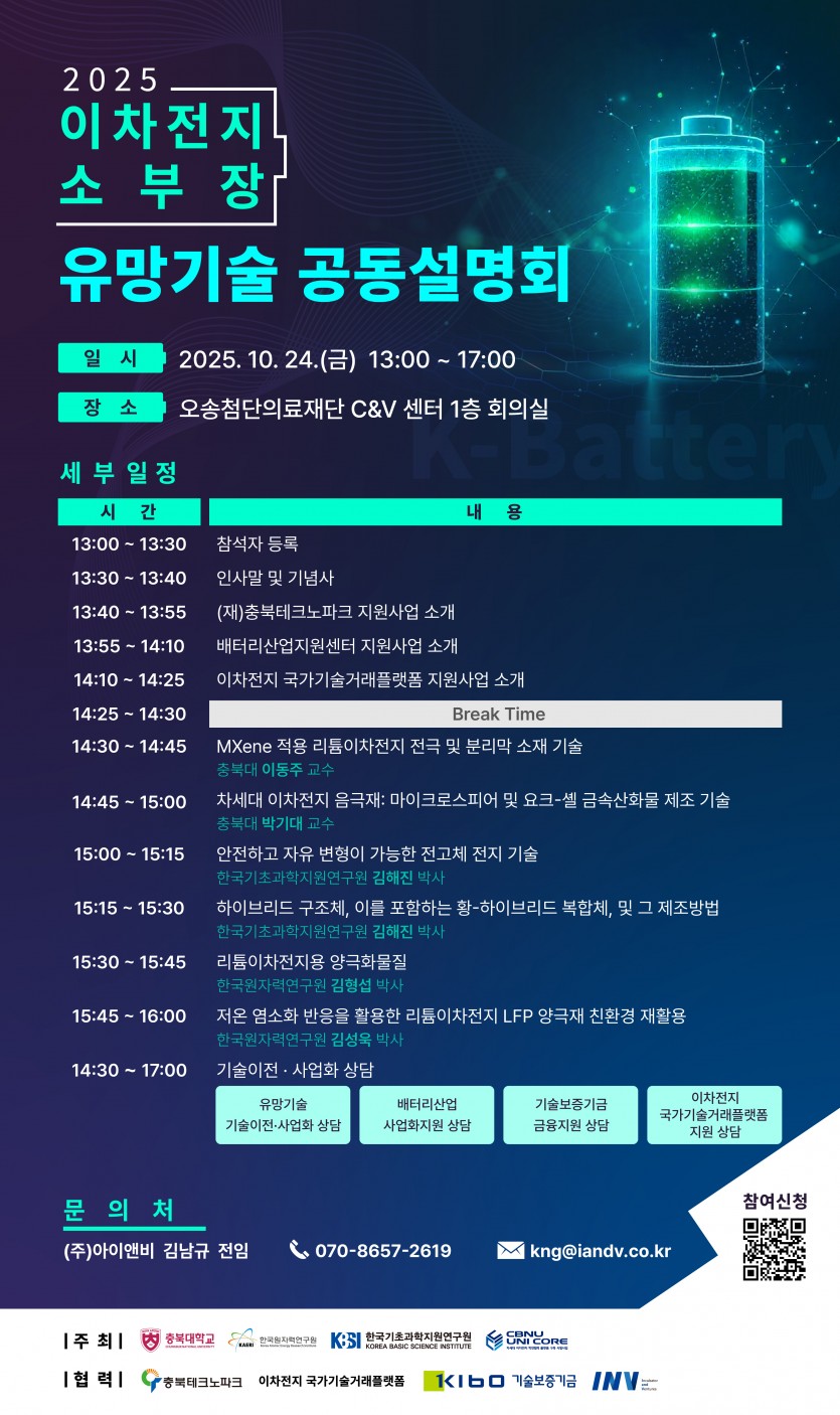 2025년 10월 24일(금) 13:00 ~ 17:00, 오송첨단의료재단 C&V 센터 1층 회의실에서 「2025 이차전지 소부장 유망기술 공동설명회」가 개최됩니다.