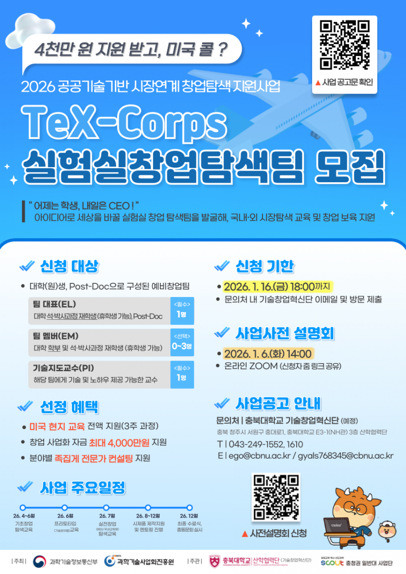충북대학교 산학협력단(예비 기술창업혁신단)에서는 대학·출연(연) 등 공공연구성과가 시장으로 신속히 확산될 수 있도록 우수 창업 모델을 연계하여, 시장 탐색 교육 및 창업 보육을 지원하는「2026년도 공공기술기반 시장연계 창업탐색 지원사업(TeX-Corps)」을 준비중에 있습니다.