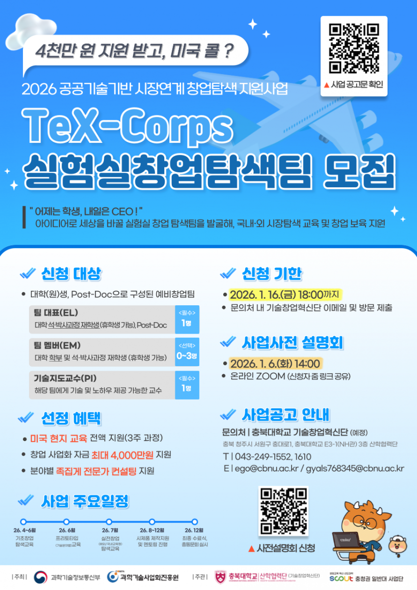 충북대학교 산학협력단(예비 기술창업혁신단)에서는 대학·출연(연) 등 공공연구성과가 시장으로 신속히 확산될 수 있도록 우수 창업 모델을 연계하여, 시장 탐색 교육 및 창업 보육을 지원하는「2026년도 공공기술기반 시장연계 창업탐색 지원사업(TeX-Corps)」을 준비중에 있습니다.