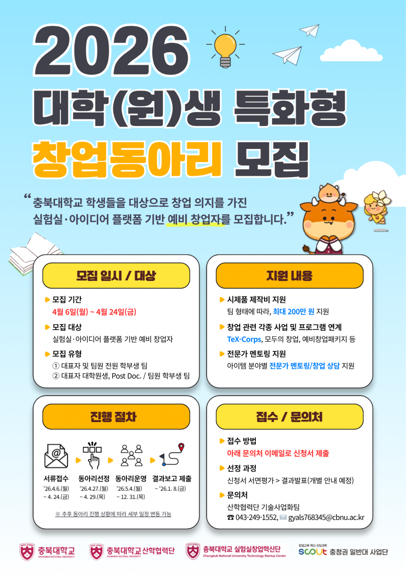 2026 충북대학교 산학협력단 대학(원)생 특화형 창업동아리 모집